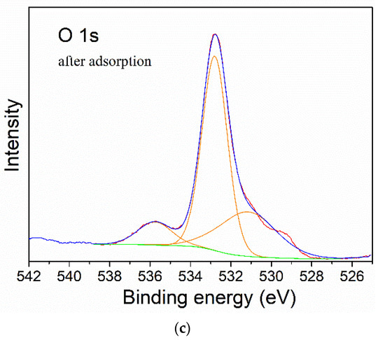 The XPS survey spectra (a), curve fitting for O 1s spectra of mag-hydrogel before (b) and after (c) MB adsorption.