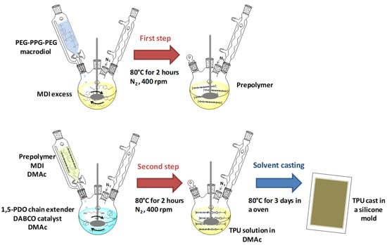 Three TPU polymers were synthesized with different weight fractions of HS: 60% HS, 70% HS, and 80% HS (% indicated is by weight). TPUs were synthesized in a reaction flask by a two-step, prepolymer method under a dry nitrogen atmosphere (Figure 1). In the first step, PEG-PPG-PEG macrodiol was added dropwise from a funnel to an excess of MDI. This mixture was heated in an oil bath at 80 °C for 2 h with stirring at 400 rpm. In this step, it was obtained a prepolymer that contains a polyol end-capped by MDI. The prepolymer stoichiometric formation was calculated according to a molar ratio of the numbers of moles of the MDI and PEG-PPG-PEG polyol as 6:1 to cap all of the hydroxyl macrodiol groups with isocyanate groups of MDI. In the second step, the mixture of an additional amount of MDI and the prepolymer previously obtained in DMAc (240 mL) was added dropwise from the funnel to a preheated mixture of 1,5-PDO and DABCO (0.3 g, 0.3% with respect to the total mass of TPU obtained that is 100 g) in DMAc (60 mL). This reaction mixture was stirred at 400 rpm for 2 h in an oil bath at 80 °C. Finally, the solution containing the TPU was poured into silicone molds and maintained in an oven at 80 °C for three days to obtain TPU casts.