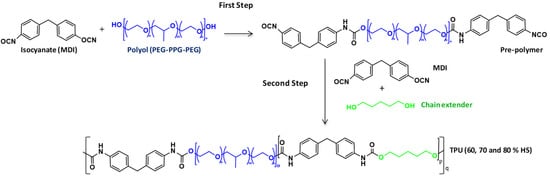 Three TPU polymers with variable HS content were used in this study (60%, 70%, and 80% of HS content). These TPUs were produced by the prepolymer process, which consists in two steps, as shown in Figure 2. In the first step, the macrodiol reacts with an excess of the diisocyanate to generate an isocyanate-terminated prepolymer. Then, the isocyanate-terminated prepolymer reacts with the chain extender in the presence of a solvent and catalyst, generating the high molecular weight TPU. Thus, these TPUs consist of linear segmented block copolymers composed of alternating soft segments (SS) from the diisocyanate and the chain extender and hard segments (HS) from the macrodiol chains. The thermodynamic incompatibility between SS and HS produces a two-phase microstructure, in which the HS segregate into semicrystalline domains through physical cross-links, whereas the SS forms amorphous domains in which the HS are dispersed [41]. Thus, HS offers rigidity, and SS provides flexibility to the TPU materials. In this study, the chemistry was varied to synthesize TPUs with high HS content.