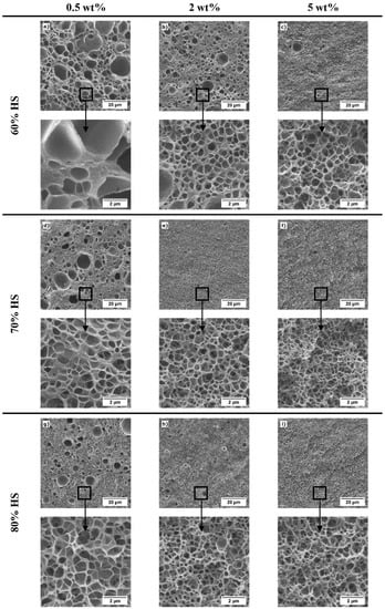 SEM images of the core of the PMMA/TPU samples saturated at 15 MPa and 25 °C and foamed at 90 °C for 1 min: (a) 0.5_60HS, (b) 2_60HS, (c) 5_60HS, (d) 0.5_70HS, (e) 2_70HS, (f) 5_70HS, (g) 0.5_80HS, (h) 2_80HS, and (i) 5_80HS. The second row of each series correspond to high magnification images.
