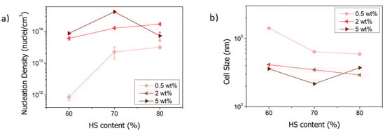 (a) Cell nucleation density and (b) cell size as a function of the HS content.