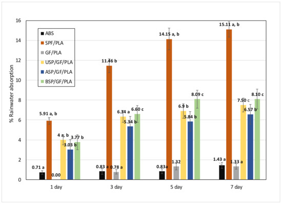 Figure 2 represents the rainwater absorption against time for ABS and various composites after 7 days of testing. The capacity for water absorption of natural fiber composites depends on the density, the existence of voids, and the bond between the fiber and the matrix [62]. Water is trapped in the void as a result of these factors, increasing the composite weight. The ABS absorbs the least rainwater, while the SPF/PLA composite absorbs most of the rainwater on the first day. Table 3 represents the rainwater absorption % value for various composites.
