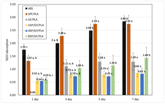 Figure 3 depicts the oil absorption capacities of ABS and various composites for 7 days of testing. The graph demonstrates that the percentage of oil absorption ranged from 0% to 3%. On the first day of testing, ABS absorbs the most oil, and by contrast GF/PLA absorbs nothing due to glass fiber’s hydrophobic nature. As the number of days increases, this % oil absorption value increases. The oil absorption of the SPF/PLA composite ranges from 1.32% to 2.74%, whereas the alkaline-treated SPF (ASP/GF/PLA composite) ranges from 0.54% to 0.82%. Table 4 represents the oil absorption % value for various composites. The high percentage of oil absorption % in SPF/PLA can be explained as the natural fibers are hydrophilic, oil absorption increases as the natural fiber content increases in the composites. Swelling of the fiber creates micro-cracks in the brittle matrix, which may function as a microchannel for oil transport [46]. The percentage of oil absorption in composites is also affected by the percentage of voids present. The oil absorption capacity decreases as the proportion of voids or gaps decreases [65]. After alkaline and benzoyl chloride treatments, the voids % reduces and the adhesion between SPF, GF, and PLA improves, resulting in fewer voids or gaps in composites and reduces oil absorption capacity [66]. Oil absorption ranges from 0% to 3%, while water absorption ranges from 0% to 15%. This discrepancy may be because water is less viscous than engine oil.