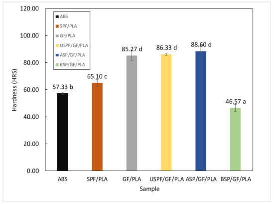 Figure 4 shows the hardness resistance values of ABS and various composites. The non-hybrid SPF/PLA composite hardness resistance value of 65.10 HRS was greater than the ABS of 57.33 HRS. According to Al Maadeed et al. [67], glass fiber-reinforced composites have a higher hardness than other composites, the hardness value of the GF/PLA composite improved to 85.27 HRS after incorporating glass fiber with PLA. Mixing alkaline-treated SPF/GF-reinforced PLA enhanced the hardness even further. Among all materials, the alkaline-treated SPF/GF/PLA had the greatest hardness value of 88.6 HRS. This might explain the excellent distribution and dispersion of alkaline-treated SPF, which results in strong interfacial bonding between fiber and PLA matrix. A positive particle dispersion can improve particle–matrix interaction and, as a result, increase the composite’s resistance to indentation. [46].