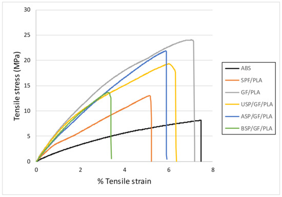 The tensile properties in terms of the tensile stress–strain curve of ABS and various composites are shown in Figure 5. Curves demonstrate that the tensile stress increases proportionately to the strain, as predicted by Hooke’s law until it reaches the proportional limit. The proportionate limitations vary according to the composites. Because of the brittle nature of PLA, all of the PLA composites failed after the first crack. It is believed that the crack begins as the tensile load was applied to the samples.