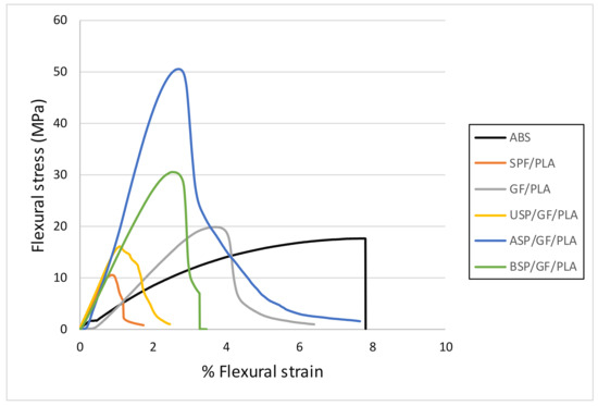 The flexural properties in terms of flexural stress–flexural strain curve of ABS and various composites are shown in Figure 6. Variations in flexural stress–flexural strain values exist based on the composite sample. It is believed that the fracture starts on the tension side of the specimen and gradually propagates in the horizontal direction of the specimen. The slope of the flexural stress–strain curves was also shown to increase for alkaline treated SPF. The alkaline-treated SPF had the highest slope in the curves, followed by the ASP/GF/PLA hybrid composites. The alkaline treatment removes lignin, hemicellulose, waxy layer, provide the rough fiber surface resulting in a decrease in SPF diameter. The interfacial bonding between SPF and PLA matrix was also enhanced [28]. This clearly shows that alkaline treatment improves the flexural properties of SPF/GF/PLA hybrid composites. Due to the high strength and modulus of GF mixed randomly with SPF, it tends to withstand the maximum load before bending failure. This is because the existence of sufficient fibers allows adequate stress transfer between the reinforced SPF and the PLA matrix [39]. The flexural property of SPF improved significantly after alkaline treatment as compared to untreated USPF/GF/PLA and SPF/PLA. Furthermore, it is evident from Figure 6 that hybridization improves flexural characteristics. This result is similar to the SPF/GF-reinforced polypropylene examined by Mukhtar et al. [29]. Another study found that the fiber treatment had a significant impact on the flexural strength value [24]. Alkaline treatment of fiber can minimize cell wall thickening, resulting in better fiber–matrix adhesion.