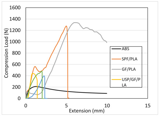 Figure 7 shows the compressive load–extension curve of the ABS and SPF/GF/PLA composites subjected to a compressive load. The graph exhibits nonlinear behavior, which is consistent with the previous study’s results [39]. The ultimate compressive strength of the composite is mostly determined by the matrix strength. On the other hand, the stiffness of the composite is strongly dependent on its reinforcement. Composite samples under compression often fail owing to shear crippling or kinking at the point of load application, as well as a combination of shear and compression. [72]. This assertion is supported by the compressive modulus results shown in Figure 7, which show that the GF/PLA composites have the highest compressive modulus. The shear–compression failure mode is the most common for composite specimens. When the fiber’s ultimate compressive stress is exceeded, the matrix/fiber interface may fracture in shear, leading to ultimate failure. After the ultimate failure, ABS, SPF/PLA, and GF/PLA curves indicate the progressive breakdown of the fibers. During compression testing, composites will undergo matrix yield followed by fiber micro-buckling, local fiber micro-buckling with an elastic matrix, shear failure, and pure fiber compressive failure [73]. However, on comparing composites made from USP/GF/PLA, ASP/GF/PLA, and BSP/GF/PLA. It has been observed that fiber treatment has no significant effect on the compressive properties of hybrid composites. BSP/GF/PLA composites have more compressive load-bearing capacity than the ASP/GF/PLA composites. Here, for compressive test, benzoyl chloride treatment is more effective than alkaline treatment. To eliminate some of the hydrogen bonds in the cellulose chains, SPF was pretreated with NaOH. This increases the surface reactivity of the fiber to benzoylation. By decreasing the hydrophilicity of the SPF with benzoylation, the compressive properties were enhanced. This increases the SPF’s compatibility with the hydrophobic matrix.