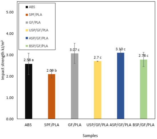 Figure 8. Impact strength kJ/m2 for various composites. (Values with different letters in the same column are significantly different (p < 0.05)).