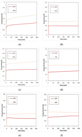 Figure 9. Creep deformation (%) versus time (minutes) for (a) ABS, (b) SPF/PLA, (c) GF/PLA, (d) USP/GF/PLA, (e) ASP/GF/PLA, and (f) BSP/GF/PLA composites.