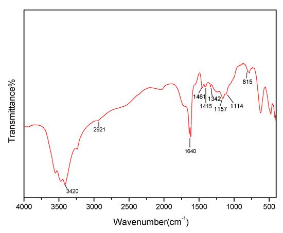 FT-IR spectroscopy is used to identify the presence of certain functional groups in molecules [31]. Figure 4 shows the FT-IR spectrum of the obtained straw-biopolymer-based hydrogel. The absorption peaks between 3200 and 3650 cm−1 were originated from the O–H stretching of cellulose, hemicellulose, and lignin. The peak observed at 2921 cm−1 corresponded to the stretching band of C–H in poly(acrylic acid) and straw biopolymers. The peaks at 1461 and 1342 cm−1 in FT-IR spectrum corresponded to the characteristic absorptions of methyl groups in lignin, and the characteristic absorption band at 1157 cm−1 corresponded to the hemicellulose and cellulose, which was ascribed to the polysaccharide unit ether chain (C–O–C). The FT-IR spectrum also displays the frequency vibrations of the C1 group and pyranose ring, which corresponded to the characteristic absorption of the β-glycosidic bond between sugar units. The characteristic absorption bands at 1415 and 1114 cm−1 corresponded to the stretching band of the aromatic nucleus and ether linkage in lignin, respectively. The spectrum of the obtained hydrogel had an obvious absorption peak at 1640 cm−1 that originated from the C=O stretching vibration in poly(acrylic acid) [32], which suggested that straw-biopolymer-based hydrogel was successfully prepared from cellulose, hemicellulose, and lignin that crosslinked by poly(acrylic acid) chains.