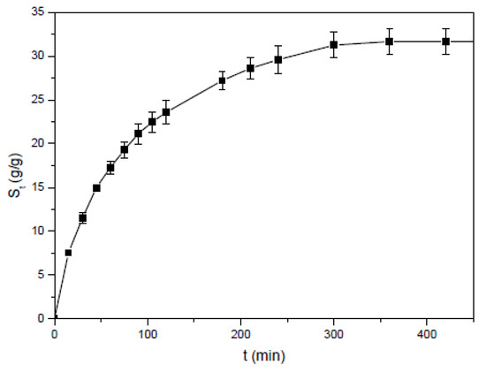 A total of 50–100 mg of the hydrogel samples were swelled in 100 mL of ultra-pure water at 25 °C. At regular time intervals, the hydrogel samples were gathered, followed by weighing after removing redundant water on the surface using a filter paper. The swelling ratio of all the samples was tested 3 times. Equation (1) was used to calculate the swelling ratio (g/g) at time t: