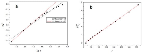 The R2 values of the two Fickian fitting curves (Figure 6a) were 0.9964 (n = 6) and 0.9722 (n = 12), respectively. Because the Fickian diffusion equation is appropriate for the initial swelling process, the R2 value of the curve (n = 6) fitted using initial swelling data was higher than that of the fitting curve (n = 12). The value of n that is the slope of fitting curve (n = 6) was 0.5787, which is between 0.5 and 1, indicating that the swelling behavior of the straw-biopolymer-based hydrogel was primarily due to the collaborative diffusion and water spread of the hydrogel, and it also indicated that the swelling kinetics of the hydrogel did not apply to Fickian diffusion. This could be explained by the first-order dynamic equation of Fickian diffusion, which presumes that the film thickness and diffusivity remain unchanged during the swelling process. The values of R2 obtained from two fitting curves (n = 6; n = 12) also proved this point.