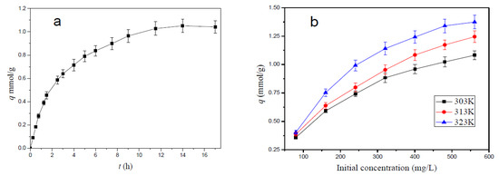 The effect of contact time on copper ion adsorption onto straw-biopolymer-based hydrogel is shown in Figure 7a. The result suggested that the adsorption amount of Cu(II) ions rose from 0.09 to 1.05 mmol/g with an extension of contact time from 0.25 h to 14 h (adsorbent dosage: 0.20 g/L; copper ion solution: 400 mg/L), and the adsorption amount increased rapidly within the first 4 h, and then the adsorption slowed down and remained stable. This could be ascribed to an interaction happening between the adsorption sites on the hydrogel surface and the copper ions during the initial several hours, and continuous adsorbing of the copper ions only occurred in its internal adsorption sites, causing a slow growth rate of adsorption amount.