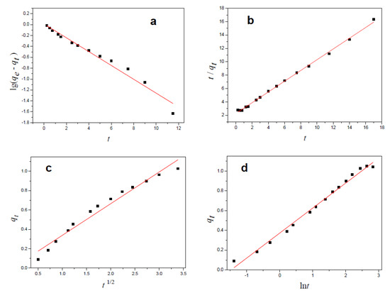 Plots of the pseudo-first-order model (a), pseudo-second-order model (b), intraparticle diffusion model (c), and elovich equation (d).