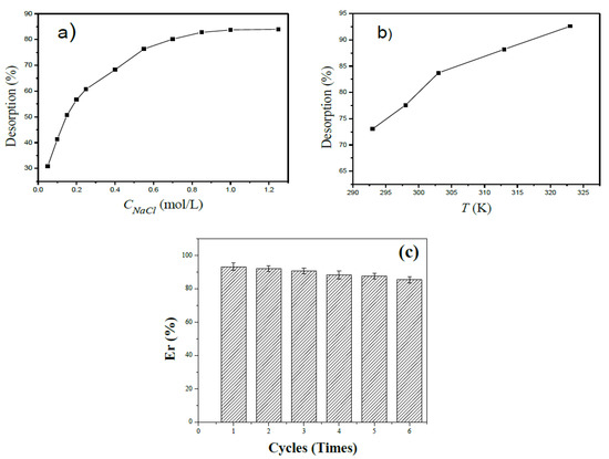 The potential application value of the prepared straw-biopolymer-based hydrogel was studied based on desorption and reusability properties [46,47]. Figure 9a shows that the desorption percent of copper ions from the used hydrogel sample increased with increasing NaCl solution concentration, and the Cu(II) ions had an easy desorption from the hydrogel adsorbent by NaCl solution. This is because higher NaCl concentration led to more Na+ replacing the Cu2+ in active sites. Figure 9b presents that the desorption percent increased as the temperature rose, and the desorption behavior of copper ions favored higher temperatures. The values of desorption percent were higher than 0.83, and the highest desorption percent was 0.92; this result indicated the good performance and recyclability of the prepared straw-biopolymer-based hydrogel as an adsorbent for copper ion removal.