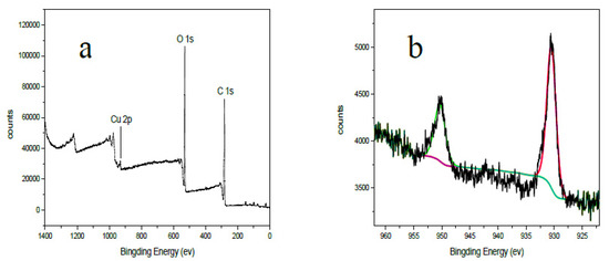 To further investigate the adsorption mechanism of the hydrogel adsorbent to Cu(II) ions, XPS was used to analyze the interactions between copper ions and the hydrogel [48]. As shown in Figure 10, a peak at the BE of 932.7 eV in the wide scan spectrum was ascribed to the Cu 2p orbital, which demonstrated that the copper ion was adsorbed on the hydrogel. There were two BE peaks at around 950.5 eV and 930.7 eV in Cu 2p spectrum, which arose from the copper ions in the hydrogel and the sulfur–oxygen bond of copper sulfate, respectively. All results showed that chemisorption was the main adsorption mechanism.