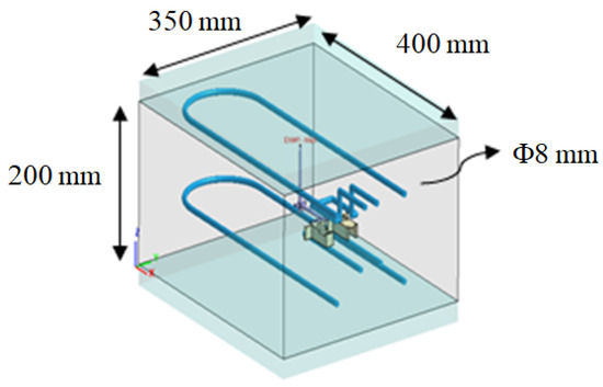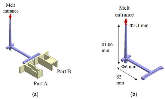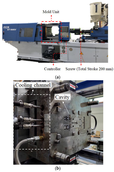 Moreover, to discover the real variation of the assembly behavior based on the characteristic lengths and to validate the simulation predictions, an injection molding experiment was constructed as follows. Figure 4a presents the FCS 150SV injection machine supplied by Fu Chun Shin Machinery Co. Ltd., Tainan City, Taiwan. This system offers a maximum injection pressure of 140 bar, a maximum injection speed of 125 mm/s (the maximum speed of the screw movement, as mentioned previously), and a maximum movement distance of 200 mm for the screw. The screw diameter is 44 mm. In addition, the real mold structure is listed in Figure 4b. The dimensions for the cavity, runner, and cooling channels are as described in Figure 2.
