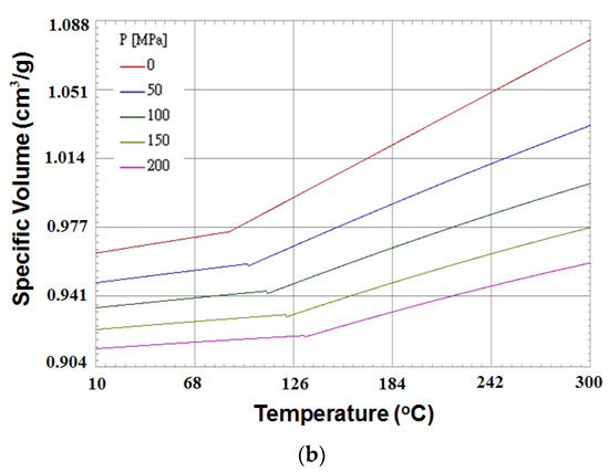 Regarding the numerical simulation of the system, Moldex3D R16® software (supplied by CoreTech System Co. Ltd., Hsinchu County, Taiwan) was adopted. The geometrical structure of the system is shown in Figure 1. Specifically, it is a family mold system with two components of parts A and B, as shown in Figure 1a. Part A is an inner part, and part B is an outer part. The associated runner, with detailed dimensions, is listed in Figure 1b. In addition, the dimensions of part A and part B are exhibited in Figure 1c,d. Their dimensions are about 40 mm × 40 mm × 14 mm. In addition, the volumes of part A and part B were 5.9 and 6.5 cm3, respectively. Furthermore, the moldbase and cooling channel layout are presented in Figure 2. There are four cooling channels inside the moldbase. For injection molding, the material used was acrylonitrile butadiene styrene, called ABS (PA757 supplied by Che-Mei, Tainan city, Taiwan). In order to perform the injection molding simulation, several material properties need to be measured and stored as the database. For example, the key properties to influence the flow and warpage are the temperature-shear rate-dependent viscosity and the specific volume against pressure-temperature (pvT), as presented in Figure 3. Those data were measured and provided from Moldex3D directly. Furthermore, to evaluate the assembly behavior of these components, and to find out the key practical factors for further study, a single factor test was performed with the associated factors as listed in Table 1. Specifically, each factor has five levels. The reasons we selected those factors is referred to in several studies mentioned earlier [14,15,16,17,18,21,22,23,24,25,27,28,29,30,31]. The key operation parameters utilized in each reference are listed in Table 2. The goal of the single factor test was to find out some practical operation parameter which can be utilized as the major control factor to evaluate the variation of the characteristic lengths. Those lengths were used to evaluate the assembly behavior and will be explained later.