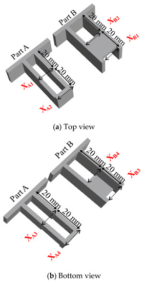 For example, X1 = (XB1 − XA1) is the characteristic length at a central location (based on part A), obtained from the difference between the inner length of part B and the outer length of part A on the top plane. X2 = (XB2 − XA2) is the characteristic length at the end location of the top plane (based on part A). Similarly, X3 and X4 are defined on the bottom plane. Theoretically, when the characteristic length (Xi) is greater than zero where the inner length of part B is larger than the outer length of part A, the assembly should be easy. On the other hand, if the characteristic length (Xi) is smaller than zero, the assembly should be not easy.