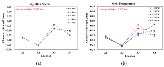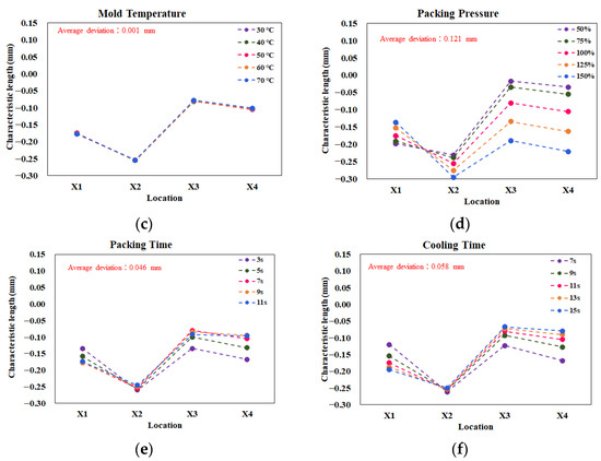 As mentioned earlier, the purpose of the single test was to determine some practical operation parameters for further study of the assembly behavior. Figure 6 shows the results of the single factor test on the influence of the characteristic lengths. For each factor, there were five levels to test, as listed in Table 1. The deviation was estimated by the maximum value of the characteristic length minus the minimum value, at each location. Then, the average deviation was utilized to evaluate the sensitivity of each factor. For example, in Figure 6a, when the injection speed setting increased from 30% to 70%, the average deviation from the injection speed was about 0.023 mm. For the melt temperature effect, the average deviation was 0.065 mm, as seen in Figure 6b. Figure 6c presents data that the mold temperature does not provide significant influence, with only a 0.001 mm deviation. Moreover, when the packing pressure is increased, it provides a significant influence, with an average deviation of 0.121 mm, as shown in Figure 6d. Similarly, the average deviations for the packing time and cooling time effects were 0.046 mm and 0.058 mm, respectively, as shown in Figure 6e,f. Overall, the packing pressure effect had the most significant influence on the variation of the characteristic lengths. In addition, the variation tendency of the characteristic lengths was almost proportional to the changes of the packing pressures. Hence, the packing pressure effect was selected as the practical parameter for further study of the assembly behavior.