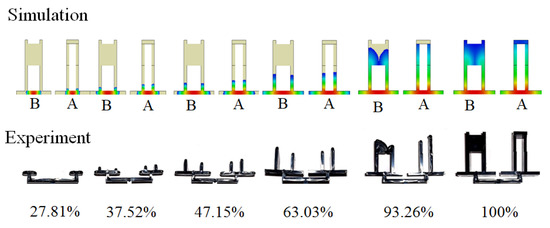 The goal for the basic test was to understand the flow behavior and the shrinkage behavior of each location for parts A and B. It was also used to realize the correlation between the characteristic length and the assembly behavior through simulation prediction and experimental verification when the injection molding simulation was performed using the operation condition of Table 3 at a 50% packing pressure setting. In Figure 7, when the volume was filled at 37.5%, the flow behavior for both parts A and B looked similar. However, from 63% to 100% volume filled, the flow imbalance phenomenon happened as expected due to the volume difference of cavities A and B. Figure 8 shows the shrinkage behavior for parts A and B. Regarding part A, XA1 and XA3 shrunk significantly because there was no constraint. The higher packing pressure, the worse the shrinkage happened, as shown in Figure 8c. However, since XA2 and XA4 were located at the end portion with strong wall constraints, the higher packing pressure provided the expansive result. On the other hand, for part B, since XB1 and XB2 were located within a concrete plane, when the packing pressure was increased, their lengths increased slightly. At the same time, XB3 and XB4 shrunk significantly because of lack of any constraint.