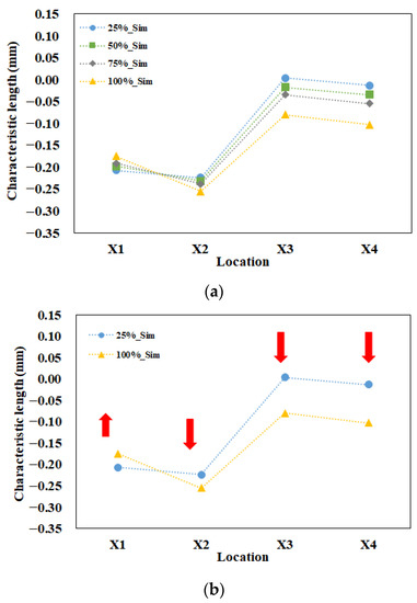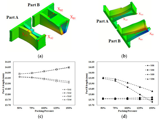 Furthermore, since the variations of the individual lengths for parts A and B were not in the same trend, we had to define the characteristic length to measure the interaction among those individual lengths. In Figure 9a, there were four tests with different packing pressure settings for simulation prediction. As the packing pressure increased, the variation of the characteristic lengths was almost linearly changed. To give better understanding, two packing pressures with lower and higher settings were selected and presented in Figure 9b. For example, at a 25% (lower) packing pressure setting, the characteristic lengths on the top plane were less than zero (X1 = −0.207 mm and X2 = −0.224 mm). Also, the characteristic lengths on the bottom plane were close to or less than zero (X3 = 0.004 mm and X4 = −0.013 mm). This means that the inner lengths of part B were less than outer lengths of part A. Theoretically, these components are not easy to assemble. When the packing pressure was increased to the 100% (higher) packing pressure setting, the characteristic lengths on the top plane were far less than zero (X1 = −0.175 mm and X2 = −0.255 mm). Also, the characteristic lengths on the bottom plane were less than zero (X3 = −0.061 mm and X4 = −0.083 mm). When the higher packing pressure was applied, although X1 became more positive, the others (X2 to X4) became more negative. This led the inner lengths of part B to become much smaller than outer lengths of part A, theoretically resulting in a more difficult assembly of parts A and B. Indeed, higher packing pressure is not a solution to manage the degree of assembly in this study.