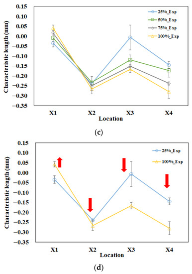 After performing the machine calibration at various injection speed settings, the machine calibration effect on the characteristic length changes could be further examined. For example, Figure 14 presents the comparison of the characteristic lengths between the simulation and experiment at the 25% to 100% packing pressure settings before and after machine calibration at the 50% injection speed setting. Since those four different characteristic lengths have different variation behavior, the calibration effect on each characteristic length was calculated individually. The calibration rate for each characteristic length is defined as in Equation (12):