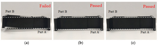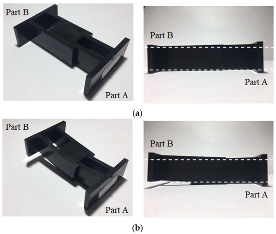 To realize the relationship between the characteristic lengths and the assembly behavior, a real integration test for parts A and B was performed, as shown in Figure 10. At the 25% packing pressure setting, the integration process assemble parts A and B was smooth and without difficulty. From the top view and side view, it is clearly seen that the assembly of parts A and B was completed as shown in Figure 10a. However, when the packing pressure setting was changed to 100%, the integration test for the assembly became very difficult. The integration test failed. Practically, the higher the packing pressure utilized, the more difficulty encountered in the assembly operation. The results of the integration test are consistent with the characteristic length behavior of the simulation prediction and experimental observation, as discussed previously. Obviously, this method to evaluate the assembly behavior using the characteristic lengths is feasible qualitatively so far.