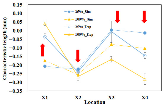 Difference of the characteristic lengths between the 100% and 25% packing pressure settings for both simulation and experiment (unit: mm).