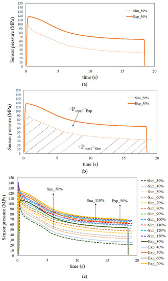 where i is either simulation or experiment, is the total accumulated driving force with (MPa·s) viscosity units, and Pinj is the injection pressure measured at the gate location at the time t.