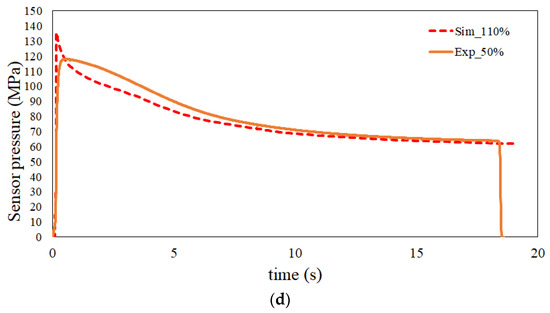 Injection pressure history curves used to perform machine calibration: (a) original injection pressure history curves at the 50% injection speed settings for both simulation and experiment, (b) schematic plots for the total driving force of the real experimental and simulation systems, (c) comparison of the history of injection pressure between the simulation and experiment at various injection speeds from 30% to 130%, (d) the matched pair for both the simulation and the experiment, where the simulation 110% injection speed setting is matched with the experimental 50% injection speed setting.
