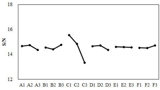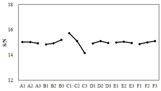 Before performing the machine calibration, the eighteen sets of injection molding trials were executed using the parameters and settings found in Table 4 and Table 5. The associated characteristic lengths and their average for each set were measured are and recorded in Table 12. For example, after the first molding simulation based on Set 1 conditions, the individual characteristic lengths were −0.15, −0.25, −0.08, and −0.12 mm, respectively. Also, the average characteristic length was −0.15 mm. Based on these calculated characteristic lengths, the standard deviation Sn was 0.06 mm, which was calculated from Equation (8). Then S/N ratio (signal-to-noise ratio) was 15.82 (obtained by Equation (9)). The quality values of the remaining seventeen sets are listed in Table 12.
