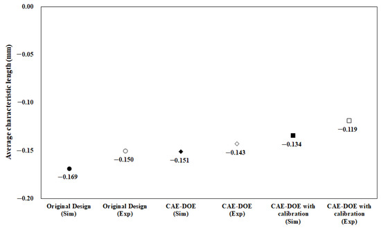 Moreover, before performing the machine calibration, the response for each factor was estimated and recorded into Table 13. The responses of all factors can be plotted as shown in Figure 15. From Table 13 and Figure 15, the optimized parameter set was determined as (A2, B3, C1, D2, E1, and F3). This optimized parameter set was applied in the injection molding simulation. The result is shown as “CAE-DOE (Sim)” in Figure 16. Compared to the original design, the optimized conditions reduced the average characteristic length from −0.169 mm (original) to −0.151 mm for the numerical simulation. Obviously, using the virtual DOE method (CAE-DOE), the quality can be improved about 10.7%. Moreover, to validate the efficiency of CAE-DOE optimization before performing the machine calibration, both the original design and the optimized parameter sets were utilized to execute the injection molding experimentally, and these results are also exhibited in Figure 16. The average characteristic length of the original design for the experimental system was −0.150 mm. Using the (CAE-DOE) optimized parameter set to perform the real injection molding, the average characteristic length was reduced to −0.143 mm, as demonstrated as “CAE-DOE (Exp)” in Figure 16. Clearly, the ease of assembly improved about 5%.