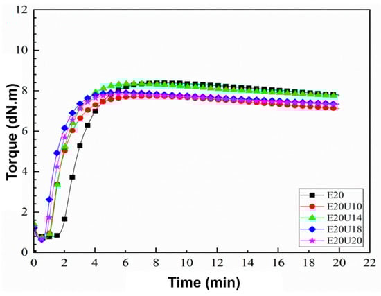 Curing curves of the composites in the presence of untreated and urea-treated HNT are shown in Figure 1. The raw data are summarized in Table 2. It was found that the scorch time (ts2) and curing time (tc90) decreased, while CRI increased with urea content. Theoretically, an alkaline chemical substance relatively accelerates the vulcanization process, while an acidic compound would retard it. Urea is an amine substance with alkaline characteristics [,]. Therefore, increasing urea content contributed to the rate of vulcanization.