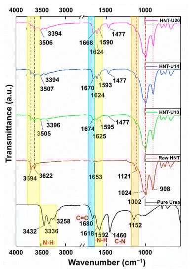 Infrared spectra of pure urea and untreated and urea-treated HNT.