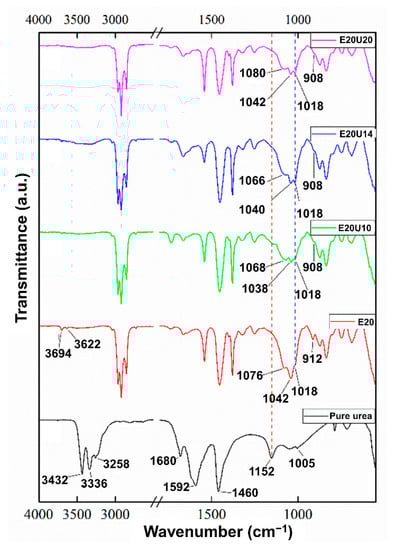 The FTIR spectra of urea, raw HNT, and urea-treated HNT are given in Figure 2. For the pure urea, peak absorption at 3432 cm−1 is assigned to N-H out-of-plane stretching vibrations and the bands at 3336 cm−1 and 3258 cm−1 are formed by N-H in-plane stretching vibrations. The N-H bending vibrations are also absorbing at 1619 cm−1 and 1592 cm−1. The peak at 1460 cm−1 is assigned to the stretching vibrations of C-N, while the NH2 rocking vibrations give absorption at 1152 cm−1 []. This clearly corresponds to the chemical structure of urea. The increased transmittance in the ranges 3500–3300 cm−1 and 1800–1400 cm−1 was clear as the level of urea was increased, corresponding to the reference band of pure urea. This corroborates that the urea was attached on the surfaces of HNT. The inner surface OH was represented at 3694 cm−1 and 3622 cm−1.