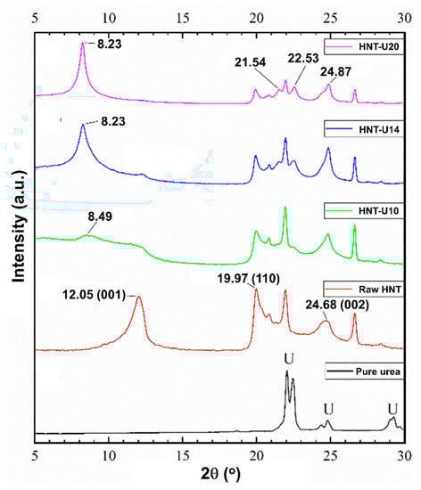 XRD scattering patterns of pure urea and untreated and urea-treated HNT.