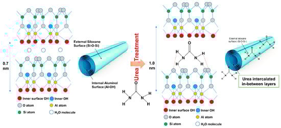 Proposed model of intercalation and interactions of urea with HNT via mechano-chemical processing modified from Yuan et al. [].