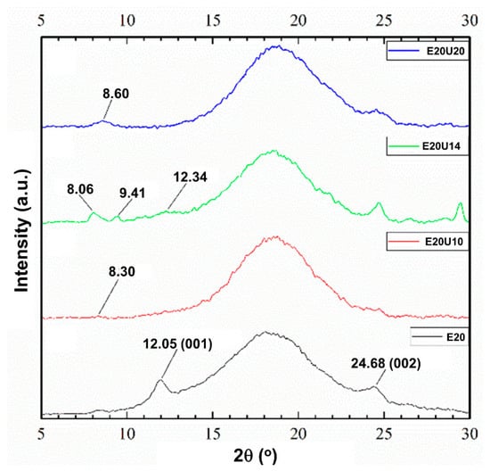 Figure 6 shows the XRD patterns of the ENR composites filled with untreated and urea-treated HNT. The diffraction peak at 2θ of 12.05° (d is 7.33 Ǻ) related to 001 plane and is absent after urea-treatment of HNT. This peak is shifted to the lower 2θ at 8.30°, 8.06°, 9.41°, or 8.60°, which correspond to basal gallery sizes of 10.64 Ǻ, 10.95 Ǻ, 9.38 Ǻ, and 10.27 Ǻ, respectively. The modification of HNT by mechano-chemical processing altered the crystal lattice of HNT. The modification with urea of HNT increased the basal distance, and hence, a lesser 2θ is presented due to the intercalation of ENR molecules to the gallery of HNT [,]. Once the intercalation occurred, possibly there were also further interactions between ENR and HNT in the system.
