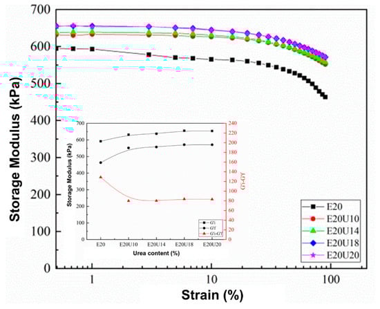 One approach to assessing possible interactions in a composite is by use of the dynamic properties. In this study, storage modulus and the Payne effect of the ENR/HNT composites made with untreated or urea-treated HNT filler were analyzed to assess the rubber–filler interactions. The results are presented in Figure 7. The storage modulus (G′) of the composites was constant in the low strain region but slightly decreased with strains larger than 50%. This is common for a viscoelastic material and is due to the molecular stability of rubber. It is noticeable that the G′ increased with urea content, indicating interactions between urea-treated HNT with ENR. There are two factors determining the increase in G′, namely the dispersion of HNT facilitated by urea as well as improved interfacial interactions between HNT and ENR caused by urea-treatment of the HNT. The Payne effect relates to the rubber–filler interactions in the composite, and its measure here was the difference in G′ between low and high strains []. A higher Payne effect indicates lesser rubber–filler interactions. It was found that the Payne effect decreased with urea content, where the value of Payne effect was found to be reduced at 62.38% after using urea for treatment. This might be due to stable rubber–filler interactions of urea-treated HNT filler in the ENR matrix. The results on the dynamic properties confirm interactions between urea-treated HNT and ENR, supporting the previous FTIR and XRD.