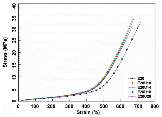 Figure 8 shows the stress–strain curves of the ENR composites made with untreated and urea-treated HNT. The stress–strain curves show the SIC. Higher stress response was found for the composites filled with urea-treated HNT, suggesting that the samples became stronger after urea-treated HNT was used. Higher compatibility between ENR and HNT in the presence of urea is responsible for these findings. Further, the area underneath the stress–strain curve was examined to confirm the compatibility of rubber and the filler. This indicates the toughness of a material []. Larger area underneath the curve corresponds to the greater toughness. The urea-treated HNT composites showed a greater area underneath the stress–strain curve than the untreated counterpart and therefore greater toughness. The curves shown are further discussed and regards crystallization behavior.