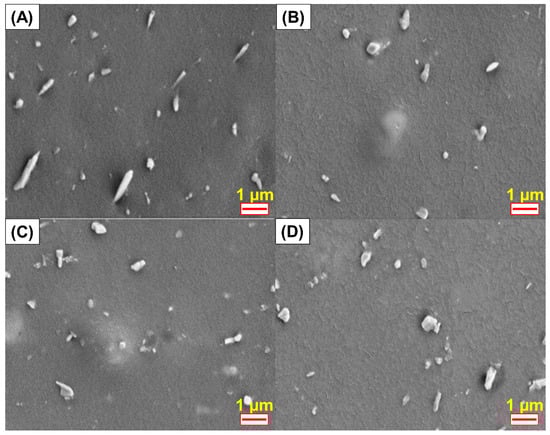 SEM photographs of ENR/HNT composites filled with untreated and urea-treated HNT; E20 (A), E20U10 (B), E20U14 (C), and E20U20 (D).