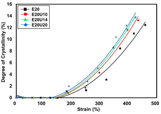 In the section on mechanical properties, the stress–strain behavior of the composites was associated with SIC. Since the nominal strain rate for tensile measurement and SIC is not similar (e.g., 0.42 s−1 and 0.042 s−1 for tensile test and WAXS, respectively). The correlation was made in the view of the stress versus crystallinity only. Previously, it was clear that the treatment of HNT by urea influenced the mechanical properties. The main factor is definitely the improved compatibility between ENR matrix and urea-treated HNT filler. The degree of crystallinity (XC) versus strain deformation is shown in Figure 10. Crystallinity was estimated from the areas in diffraction pattern for 200 and 120 plane reflections [,]. The XC increased with strain due to molecular chain orientation, as expected. The onset strain for SIC was determined from interception of a regression line for Xc as a function of strain (see Figure 11). The onset for SIC with urea-treated HNT filler was observed to be lower as a function of urea content. The interaction that takes place in the presence of urea can help to pull the surrounding molecular chains and speeds up the crystallization process. When considering the XC and the stress propagation from tensile measurement (see Figure 8), it is clear that the XC corresponded well with the stress, and the trend of the curves is also similar as urea content increased. From the stress–strain curves, it is obvious that the stress started to increase towards the urea content. This is responsible to the formation of interfacial contact, as discussed earlier.