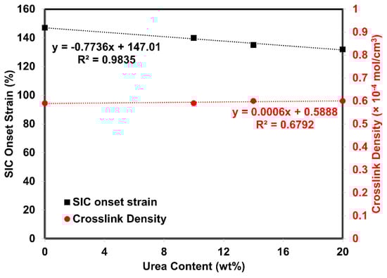 Earlier onset for SIC can be found usually for the filled composite. Poompradu et al. [] reported that the lateral crystallite size was decreased, but the orientational fluctuation increased by the inclusion of filler. The lattice of the SIC changed almost linearly with the nominal stress. In addition, the degree of lattice deformation decreased with the filler content, especially in the CB-filled system. In addition to this, onset for SIC was differently observed depending on the filler’s characteristics. Ozbas et al. [] compared the SIC of graphene and CB-filled composites. They found that the onset of SIC occurs at significantly lower strains for graphene-filled NR samples compared with CB-filled NR even at low loadings. Chenal et al. [] further explained that the onset of SIC is ruled by the strain amplification induced by the filler presence. Moreover, additional interaction in rubber network is also responsible for either accelerating or slowing down the crystallization rate depending on rubber matrix chemical crosslink density. Candau et al. [] together with the report of Ozbas et al. [] further emphasized that the rubber–filler interactions may fasten the SIC at low crosslink density. This is because high crosslinking may interfere the chain orientation and results in reduction of the SIC. Therefore, the crosslink density of this composite was also reported and shown in Figure 11. It can be seen that the crosslink density observed was more or less the same over the content of urea. This is a good indication that network chain density is unchangeably involved in the development of SIC regardless of urea content. As a consequence, it can be said that the change in SIC was promoted by rubber–filler interactions.