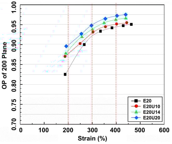 The orientation parameter (OP) indicates indirectly the molecular chain orientation and alignment and can be calculated from the Herman equation [,]. The OP for the composites is shown in Figure 12. Completely oriented molecular chains would give OP value 1 []. Here, the OP for the composites was lesser at low strains and grew with increasing strain, confirming that stretching oriented the molecular chains. The composites filled with urea-treated HNT showed higher OP values at low strains, indicating that the modification of HNT increases rubber–filler interactions, and accordingly, more molecular chain orientation was found for composites with urea-treated HNT.