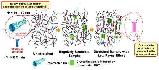 From these results, correlation between the SIC and corresponding interaction between ENR and HNT in the presence of urea is represented in a schematic model shown in Figure 13. Referring to the scheme, nothing happened at the un-stretched stage of the sample; the ENR matrix may be in contact with the HNT due to the interfacial interaction created by the unique characteristics of the HNT. When the strain was applied to the sample, crystallization of the ENR was then induced due to the stress concentration point on the HNT surfaces, and the crystallinity increased in association with the orientation of the HNT. HNT is orientated and aligned along the stretching direction. As a consequence, the ENR chains rearrange and crystallize. This always happens regardless of whether untreated or urea-treated HNT is concerned. This kind of phenomenon usually occurs in the filled composites, and it has been reported elsewhere [,,]. However, it is interesting to highlight that the crystallinity of the ENR matrix increases steeply due to the collaborative crystallization of ENR and HNT in association with the contribution of the urea. Higher rubber–filler interactions as indicated by lower Payne effect is responsible for such change. The presence of the urea has played an important role in pulling the surrounding molecular chains. Thus, a significant increase in crystallization is observed at higher strains, and this is in agreement with results observed previously in the stress–strain behaviors and WAXS profiles.