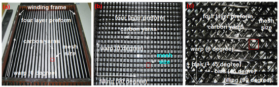 Polyacrylonitrile (PAN) based carbon fiber (AKSACA, DowAksa, Yalova, Turkey) were employed to design the multiaxis three-dimensional (3D) preforms. The properties of the carbon fibers are exhibited in Table 1. The tensile strength, modulus, and elongation at break of PAN-based carbon fibers were 4200 MPa, 240 GPa, and 1.80%, respectively, as provided in Table 1. Moreover, the PAN-based carbon fiber’s linear density, density, and diameter were 1600 tex (24 K, sizing type: A-42, amount: 0.5–1.0 wt.%), 1.76 g/cm3, and 6 μm, respectively.