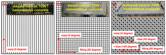 All the multiaxis 3D carbon concrete structures (C-1D, C-2D, and C-4D) was principally composed of four layers with different directions such as uniaxial (0°), biaxial (0°/90°), and multiaxial (90°/±45°/0°) direction. Some of the multiaxis 3D carbon concrete composites are shown in Figure 2a–c. As provided in Table 2, the stacking sequences of C-1D, C-2D, and C-4D were [0°]4, [90°/0°]2, and [90°/±45°/0°]1, respectively.