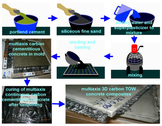 The PAN carbon filamentary TOWs preforms were consolidated via hand lay-up to make multiaxis 3D concrete composites. The multiaxis 3D concrete composite processing steps are shown schematically in Figure 3. A Hobart-type mixer (20-L capacity) was used to prepare the cementitious matrix mixtures. First, the solid constituents such as Portland cement (735.84 kg/m3, 34.51, wt.%) and siliceous fine sand (1030.35 kg/m3; 48.33, wt.%) were weighed and then mixed at 100 rpm for a minute (Figure 3). After that, water (364.91 kg/m3; 17.12, wt.%) and superplasticizer (0.917 kg/m3; 0.04, wt.%) were added with the dry mixture and mixed for one minute at 150 rpm [86]. Then a homogeneous cementitious matrix was achieved by mixing again at 300 rpm for two minutes. Considering the preform architecture design, PAN-based carbon TOWs were wound using the specially developed flat winding-molding rig (Figure 1). The cementitious mixture was introduced to the flat winding rig using the hand lay-up technique (Figure 3). The flat winding rig was manually shaken during the matrix inclusion to obtain complete penetration of the cementitious matrix into the opening of the preform and to contribute a strong preform-matrix bonding. After casting at atmospheric conditions (65 ± 2% relative humidity and 22 ± 2 °C), matrix inserted winding-molding rig was left 24 h for obtaining rigid consolidation. Then, all panel samples in the winding rig were removed. Finally, all multiaxis 3D carbon fiber concrete samples were wrapped with polyethylene film (Reverans Plastik Ambalaj Ltd., Ankara, Turkey) to cure at 95 ± 5% relative humidity and 23 ± 2 °C for 28 days (Figure 3), and samples were ready for the bending test.