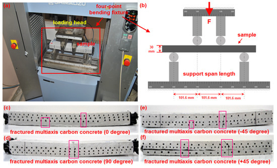 Multiaxis 3D carbon concretes during the flexural test. (a) Pictorial view of the flexural test of sample in the universal testing machine; (b) specimens with a four-point flexural test fixture, schematic; (c) fractured carbon concrete, C-4D-(0°); (d) C-4D-(90°); (e) C-4D-(+45°), and (f) C-4D-(−45°) (digital image).